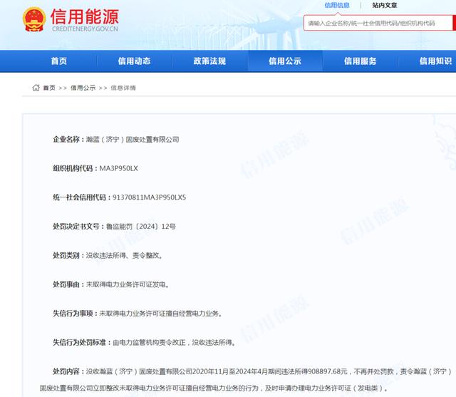 日前,信用能源公布了對(duì)瀚藍(lán)(濟(jì)寧)固廢處置有限公司的行政處罰決定,魯監(jiān)能罰〔2024〕12號(hào)處罰決定書文號(hào)顯示,瀚藍(lán)(濟(jì)寧)固廢處置有限公司未取得電力業(yè)務(wù)許可證發(fā)電。山東能源監(jiān)管辦沒收瀚藍(lán)(濟(jì)寧)固廢處置有限公司2020年11月至2024年4月期間違法所得908897.68元,不再并處罰款,責(zé)令瀚藍(lán)(濟(jì)寧)固廢處置有限公司立即整改未取得電力業(yè)務(wù)許可證擅自經(jīng)營(yíng)電力業(yè)務(wù)的行為,及時(shí)申請(qǐng)辦理電力業(yè)務(wù)許可證(發(fā)電類)。
