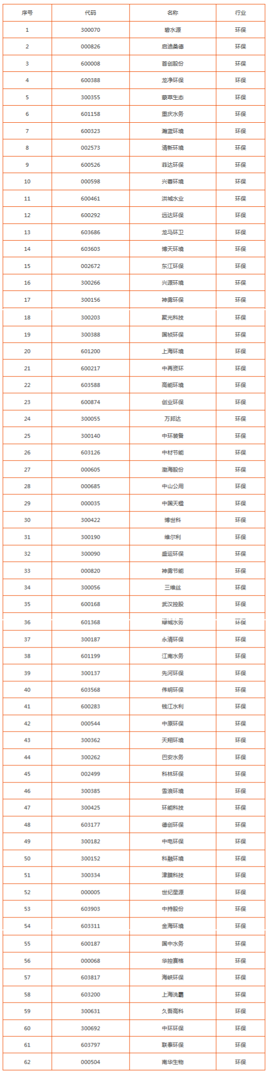 從具體企業(yè)來看,A股環(huán)保行業(yè)有62家上市公司。