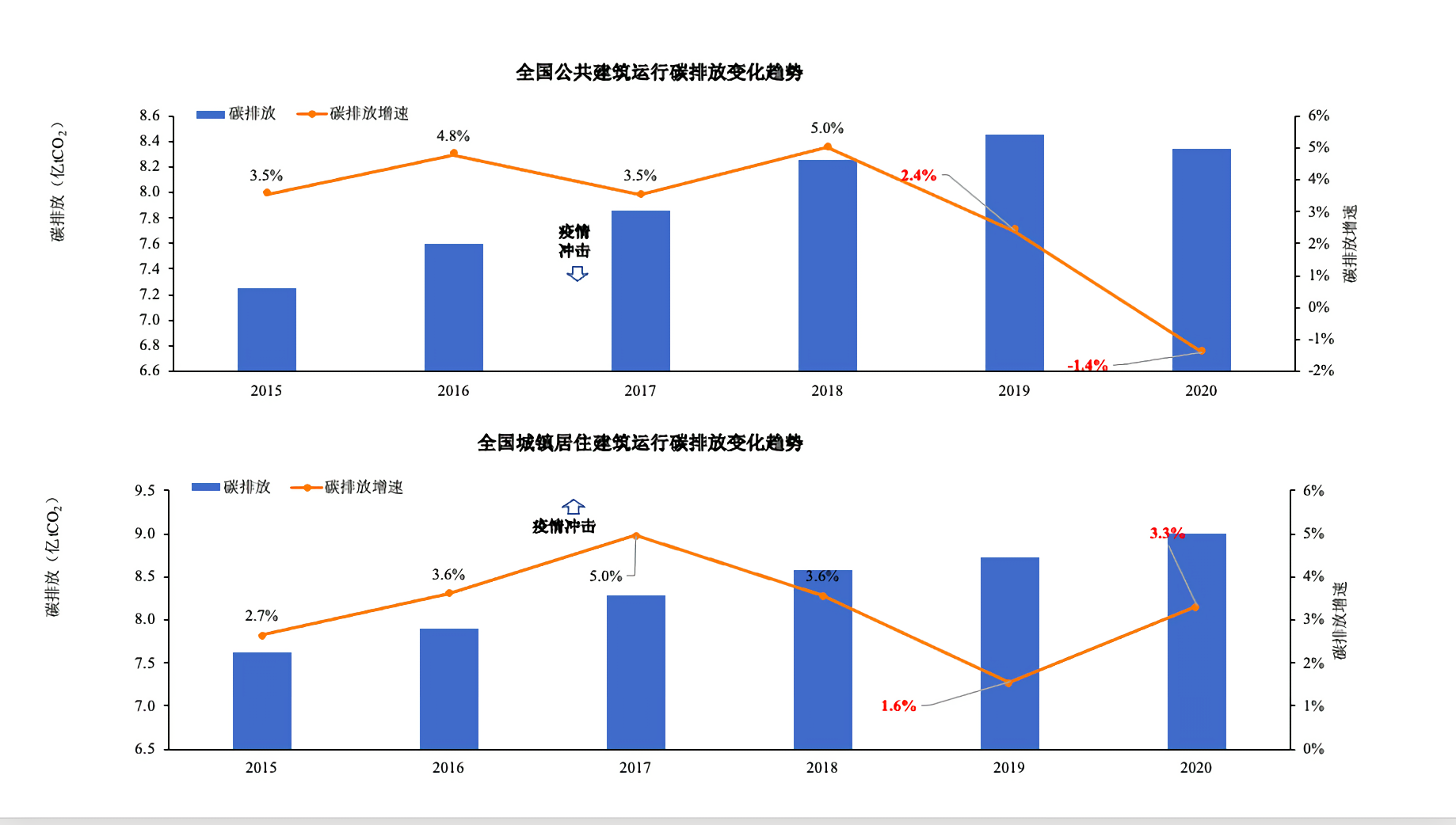 報(bào)告還披露,新冠疫情對(duì)建筑碳排放結(jié)構(gòu)也產(chǎn)生了影響。即公共建筑碳排放減少,而城鎮(zhèn)居住建筑碳排放增加。全國(guó)及多個(gè)省市2020年公共建筑碳排放總量出現(xiàn)下降現(xiàn)象,全國(guó)公共建筑碳排放下降1.4%。與此同時(shí),2020年全國(guó)居住建筑碳排放增速(3.3%)約是2019年增速的2倍(1.6%)。