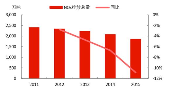 經(jīng)過“十二五”的治理,四項(xiàng)污染物減排約束性指標(biāo)均實(shí)現(xiàn)了持續(xù)下降,完成了“十二五”的減排任務(wù),取得了一定的環(huán)保成果。2015年:1)COD的排放量為2224萬噸,且每年以3%左右的速度下降;2)氨氮的排放量為230萬噸,且每年以3%左右的速度下降;3)SO2的排放量為1859萬噸,每年基本以4%左右的速度下降,而收關(guān)年2015年下降速度高達(dá)5.84%;4)NOx的排放量為1852萬噸,“十二五”剛開始治理,當(dāng)前的下降速度還處于上升趨勢(shì),收關(guān)年2015年下降速度高達(dá)10.89%。