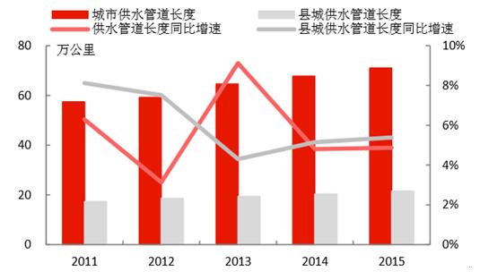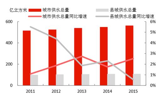 城鎮(zhèn)化的推進(jìn),為水務(wù)行業(yè)持續(xù)帶來增量空間。1)我國城鎮(zhèn)人口2015年達(dá)到7.71億,近年城鎮(zhèn)人口增速維持在3%左右;城市建成區(qū)面積2015年達(dá)到5.21萬平方公里,近年面積增速維持在4-5%。2)城市供水總量在2015年達(dá)到561億立方米,同比增速為2.5%;縣城的供水量達(dá)106.9億立方米,增速有所下降,僅為0.56%。3)城市供水管網(wǎng)長(zhǎng)度在2015年達(dá)到71.0萬公里,同比增速為4.87%;縣城的供水管網(wǎng)長(zhǎng)度為21.5萬公里,同比增速達(dá)5.39%;通過管網(wǎng)建設(shè),是的用水普及率持續(xù)提升,城市和縣城2015年的用水普及率分別為98.1%和90.0%。4)城市污水處理能力在2015年達(dá)到1.40億立方米/日,同比增長(zhǎng)7.19%;縣城達(dá)到2999萬立方米/日,同比增長(zhǎng)了4.06%,城市和縣城的污水處理率分別達(dá)到91.9%和85.2%,較2010年分別提升了9.6和25.1個(gè)百分點(diǎn)。