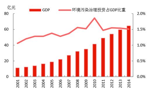 從國家統(tǒng)計(jì)局的數(shù)據(jù)可以看到,我國在環(huán)境污染治理方面的投資量,呈現(xiàn)上升趨勢(shì),2014年達(dá)到9576億元;近年占GPD的比重維持在1.5%左右,較2001年提升約0.5個(gè)百分點(diǎn)。發(fā)改委、環(huán)保部印發(fā)《關(guān)于培育環(huán)境治理和生態(tài)保護(hù)市場(chǎng)主體的意見》,提出目標(biāo),“十三五”綠色環(huán)保產(chǎn)業(yè)產(chǎn)值年均增長(zhǎng)15%以上,遠(yuǎn)高于CDP的增長(zhǎng)目標(biāo),為經(jīng)濟(jì)增長(zhǎng)注入動(dòng)力。