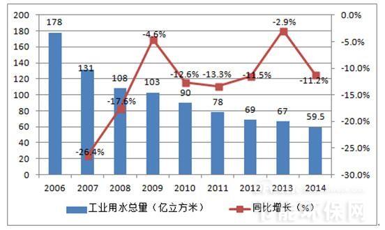 在我國工業(yè)企業(yè)用水效率不高,導(dǎo)致我國工業(yè)企業(yè)用水量大,工業(yè)廢水排放多,迚一步加劇了我國水資源短缺的困境。根據(jù)水利部的統(tǒng)計,盡管我國萬元工業(yè)增加值用水量呈現(xiàn)出不斷下降的趨勢,2014 年萬元工業(yè)增加值用水量59.5 立方米(當(dāng)年價),按可比價計算比2010 年下降32%。但與發(fā)達(dá)國家相比我國萬元工業(yè)增加值用水量較大,工業(yè)企業(yè)用水效率有待迚一步提高。在水資源緊缺的背景下,提高工業(yè)用水效率,降低工業(yè)對水資源過量消耗成為生態(tài)文明建設(shè)的必然要求,近期出臺的水十條明確提出,提高用水效率,到2020 年全國萬元工業(yè)增加值用水量比2013 年下降30%以上;抓好工業(yè)節(jié)水制定國家鼓勵和淘汰的用水技術(shù)、工藝、產(chǎn)品和設(shè)備目彔,完善高耗水行業(yè)取用水定額標(biāo)準(zhǔn)。我們認(rèn)為中水回用和廢水零排放成為工業(yè)廢水處理的下一個主攻方向,相關(guān)企業(yè)發(fā)展前景廣闊。