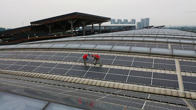 國網(wǎng)湖北電力員工檢查宜都市會展中心光伏設(shè)備運(yùn)行情況。