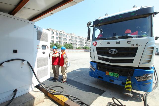 國網(wǎng)江蘇電力員工為江蘇永鋼集團(tuán)有限公司電動重卡檢查充電樁。