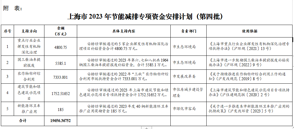 上海市下達2023年第四批節(jié)能減排專項資金安排計劃