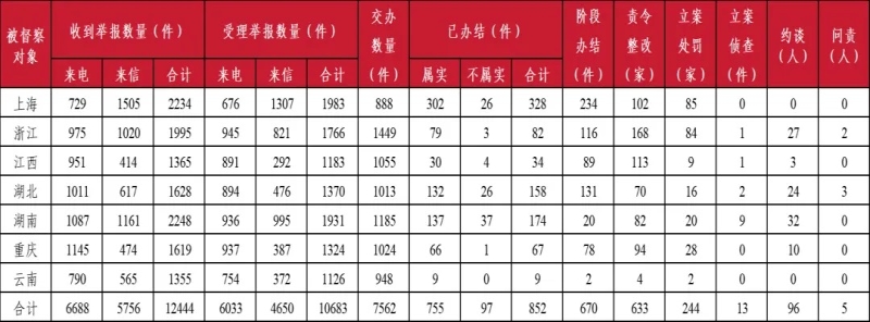 截至5月20日晚20:00,各督察組共收到群眾來電、來信舉報12444件,受理有效舉報10683件,經(jīng)梳理合并重復舉報,累計向被督察地方轉辦7562件;被督察地方已辦結或階段辦結1522件,其中立案處罰244家;立案偵查13件;約談黨政領導干部96人,問責黨政領導干部5人。