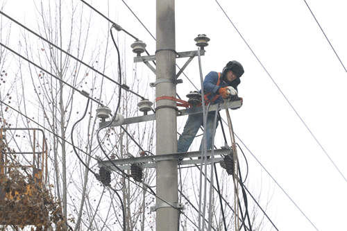 圖為搶修人員冒雪安裝新的導線,盡全力在最短時間內恢復線路正常運行。(徐浩然)