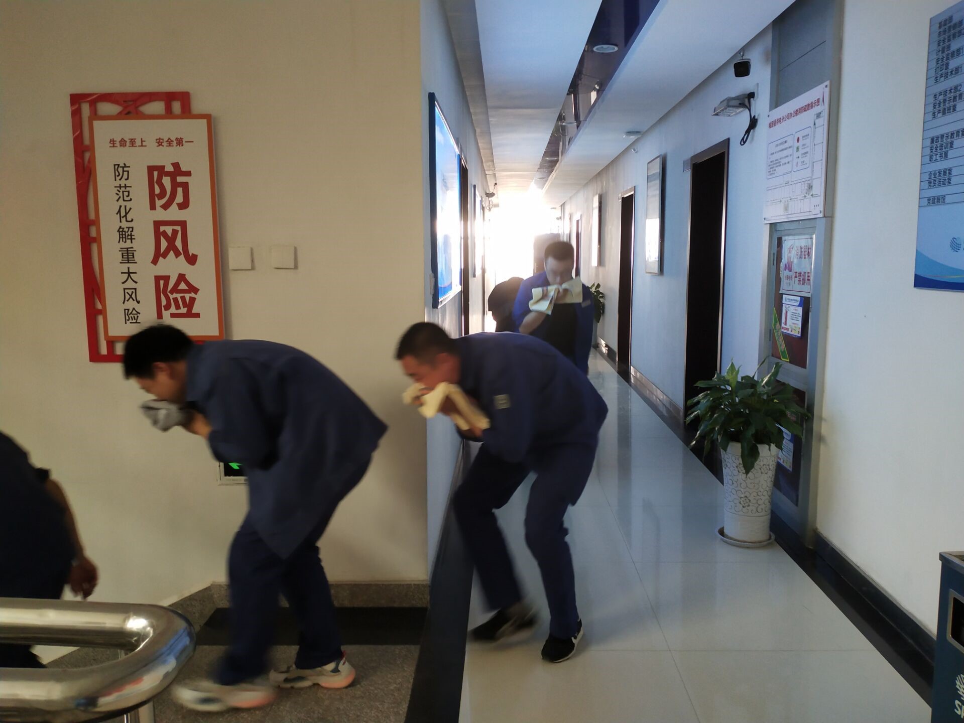 接著,隨著機(jī)關(guān)大樓火警響起,應(yīng)急疏散演練活動(dòng)正式開(kāi)始,全體員工在該公司應(yīng)急消防員的引導(dǎo)下用手捂著口鼻,彎著身子,有序地按照既定逃生路線(xiàn)逃生,安全到達(dá)指定地點(diǎn)集合,應(yīng)急疏散逃生演練圓滿(mǎn)完成,取得了預(yù)期效果。