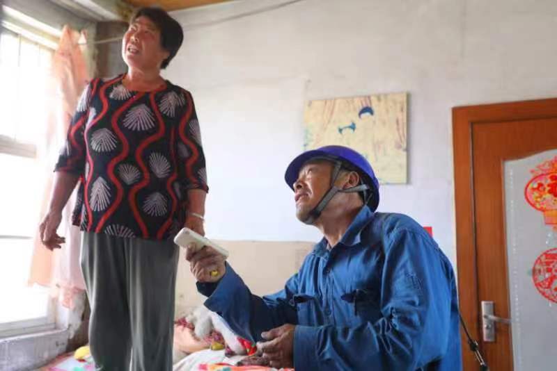 土家窯自然村坐落在玖山腳下,半山腰上還有7戶老人,只有一條羊腸小道能到達。7月7日下午,山上的王繼福托人打電話,說家里沒電了,水缸也空了,沒法抽水。遲玉朋急匆匆趕了去,92歲的王繼福和老伴已經(jīng)挑不動水了,老倆口只能靠電機抽水用。遲玉朋扛著梯子、背著工具包,從山下爬到山腰,午后天氣超乎異常的悶熱,汗水很快浸透衣服。