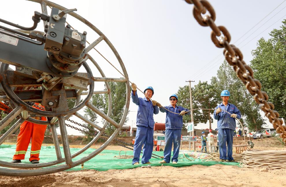 近日,河北省石家莊晉州市氣溫持續(xù)攀升,在河北石家莊晉州園區(qū)110千伏輸變電線路工程施工現(xiàn)場(chǎng),國(guó)網(wǎng)石家莊供電公司的50多名施工人員正在有條不紊地開(kāi)展張力放線施工作業(yè)。