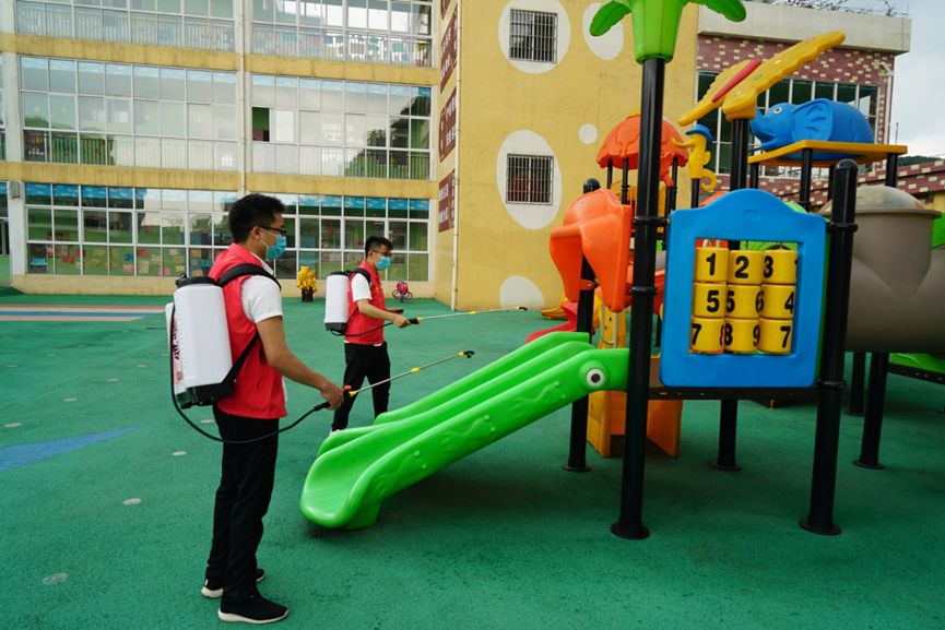 富川縣公司志愿者們正在為富川縣第二幼兒園游玩區(qū)域消毒