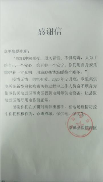 章里集供電所所長(zhǎng)吳超接過(guò)重量雖輕卻又意義非凡的感謝信后激動(dòng)地說(shuō):“謝謝你們對(duì)我們工作的肯定,疫情戰(zhàn)場(chǎng)上,是你們白衣天使沖鋒在前。作為國(guó)家電網(wǎng)人,我們更要發(fā)揚(yáng)頂?shù)蒙稀⒖康米?、打得贏得電力鐵軍精神,攜手打贏這場(chǎng)沒(méi)有硝煙的戰(zhàn)疫!”