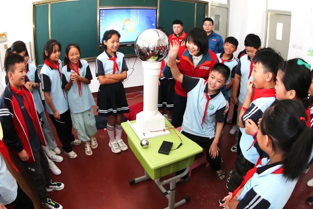國網(wǎng)山東棗莊供電公司志愿者在薛城夏莊小學(xué)電力愛心教室,與學(xué)生一起做用電小實(shí)驗(yàn)