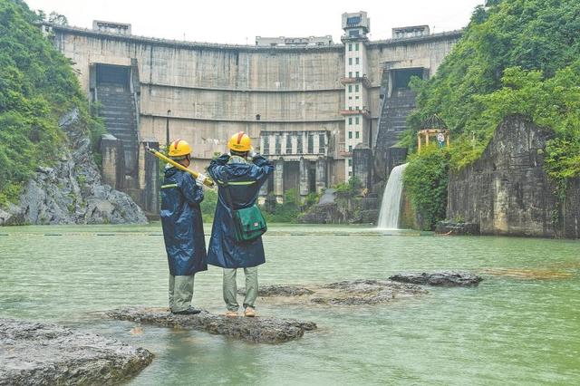 國網湖北恩施宣恩縣供電公司員工冒雨查看龍洞電站大壩庫區(qū)水情。