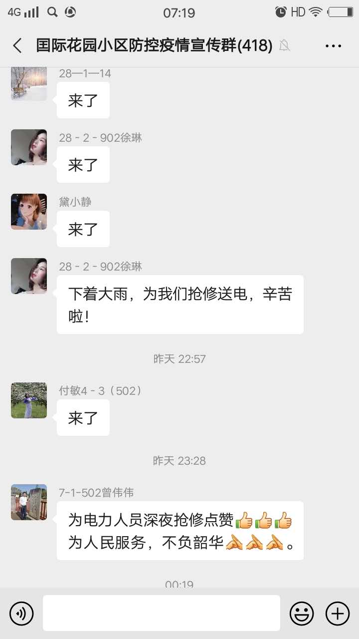 中國電力網(wǎng)訊 客戶又一次在微信群里表揚國網(wǎng)南豐縣供電公司搶修人員“為人民服務,不負韶華,”并為他們點贊。