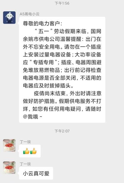 中國(guó)電力網(wǎng)訊 “‘五一’勞動(dòng)節(jié)假期來臨,國(guó)網(wǎng)余姚市供電公司溫馨提醒:出門在外不忘安全用電。假期供電服務(wù)不打烊,如您有任何用電疑問,請(qǐng)隨時(shí)@我哦~”4月29日下午2點(diǎn),余姚市陽(yáng)光水岸小區(qū)微信群中收到這樣一條微信,受到小區(qū)群眾的一致好評(píng)。