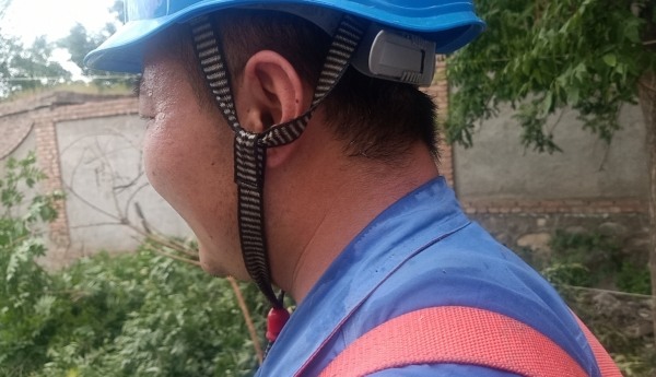 在現(xiàn)場(chǎng),工作電鋸的呲呲聲、斧頭的敲打聲、腳扣攀登電桿的噠噠聲......每位工作人員全然顧不上天氣的悶熱,井然有序的全身心投入,“高空”開展伐樹、修剪作業(yè),不一會(huì)汗水就濕透了衣背。
