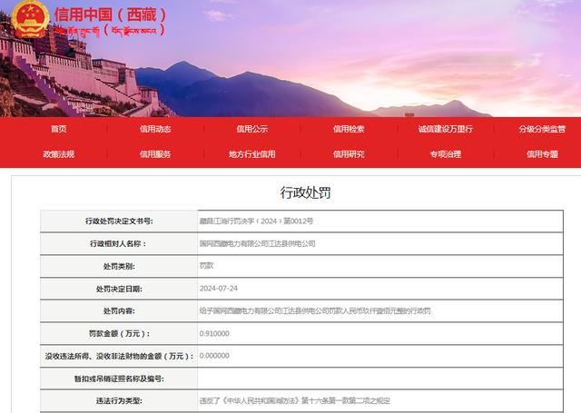 近日國(guó)網(wǎng)西藏電力有限公司江達(dá)縣供電公司因營(yíng)業(yè)大廳內(nèi)未設(shè)置疏散指示標(biāo)志,被江達(dá)縣消防救援大隊(duì)給予罰款人民幣9100元整的行政處罰。