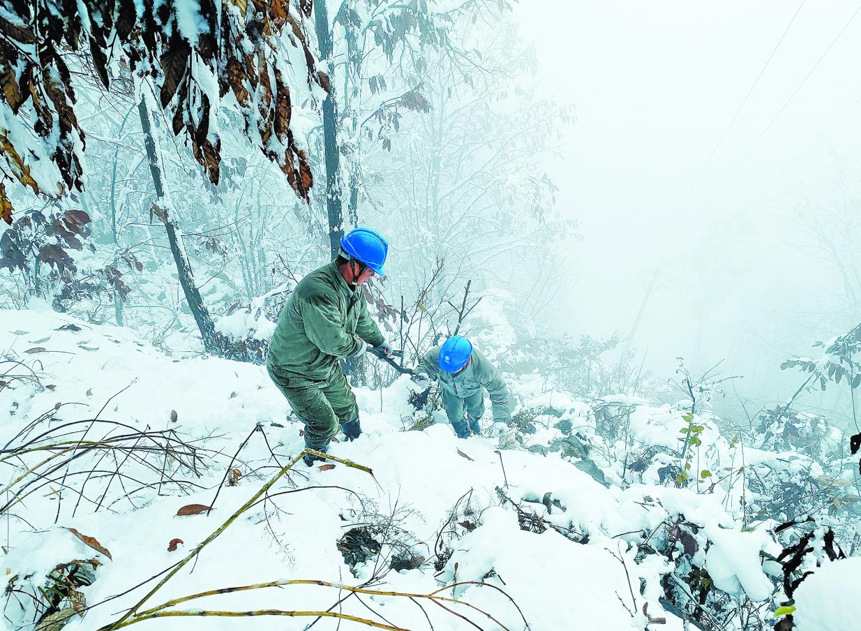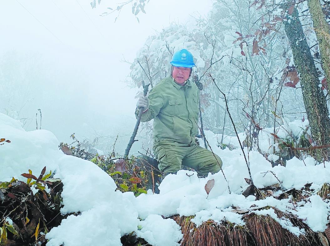 國網鄖西縣供電公司員工借助樹木拐杖巡視易覆冰區(qū)段線路。
