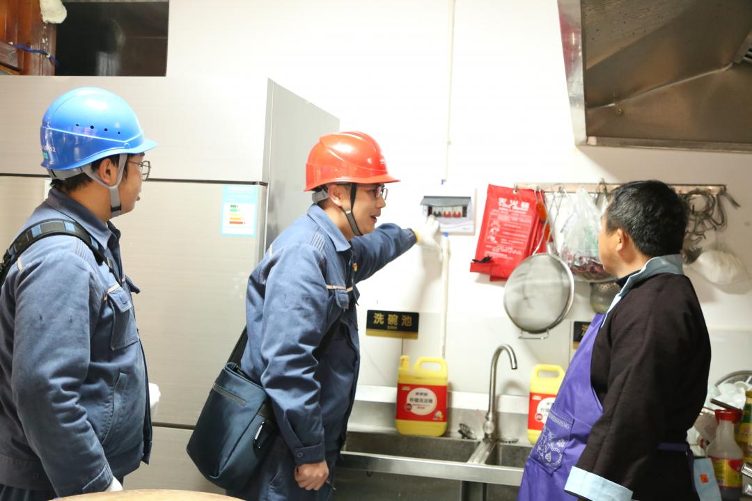 都勻荔波供電局組織黨員骨干走進瑤山古寨景區(qū)民宿商戶檢查電廚房用電情況 王文濤攝
