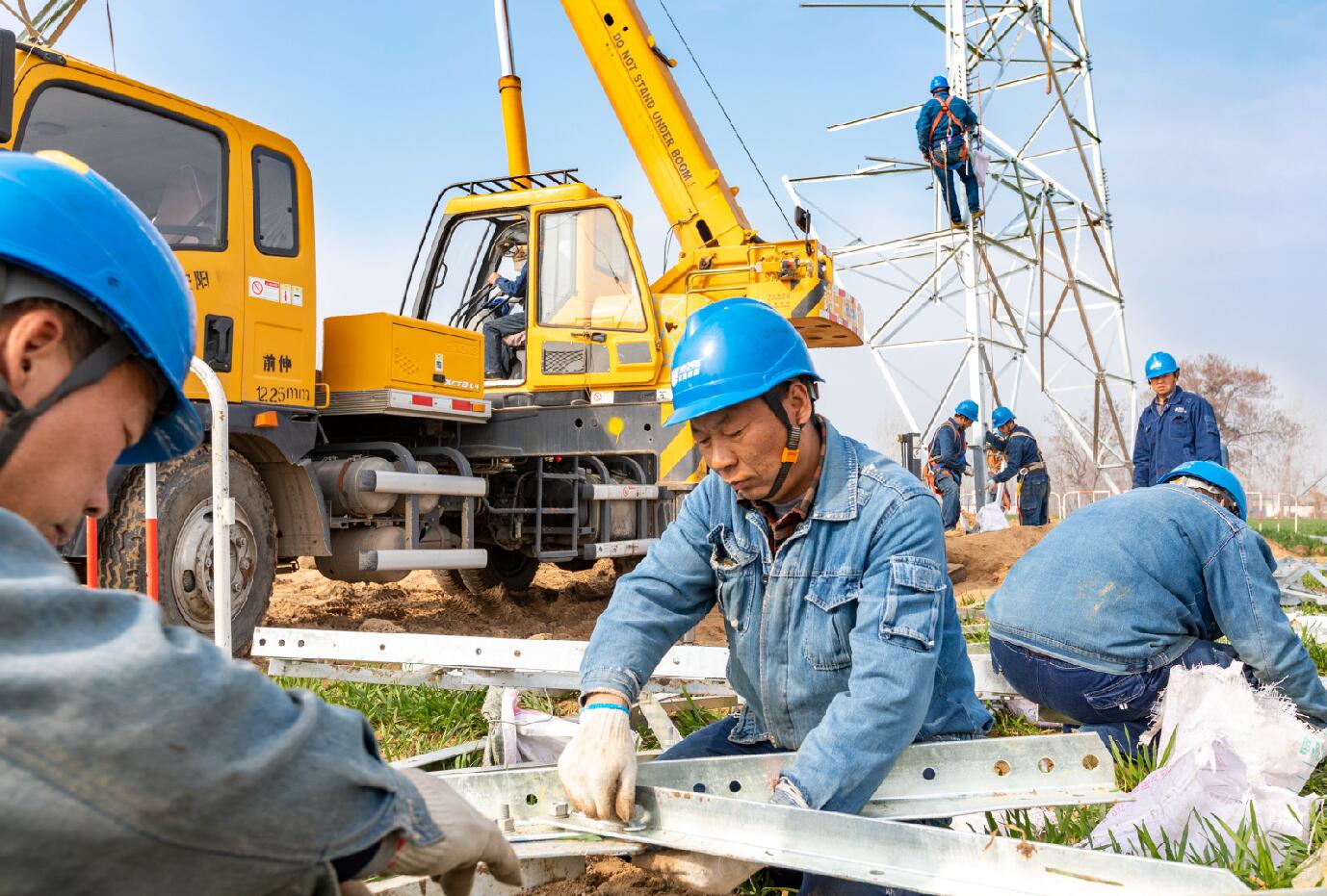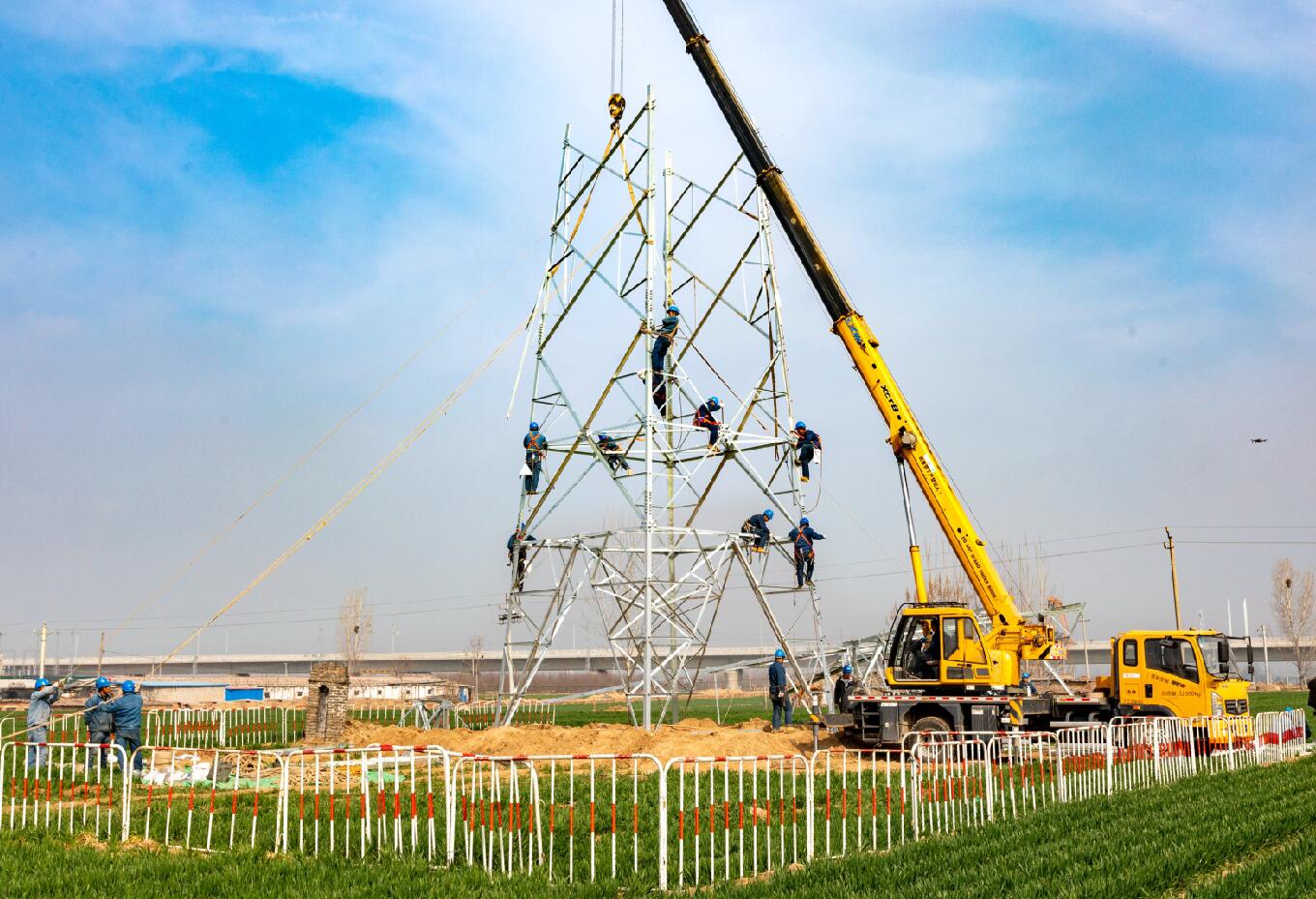 3月12日,在河南滑縣白道口鎮(zhèn)后吾旺村,太陽(yáng)剛出來(lái),麥苗上還掛著晶瑩的露珠。走在麥隴間有種踏春的喜悅,露珠也瞬間浸透了腳上的鞋。看向那邊卻是另一番景象,新建220千伏電力線(xiàn)路跨越高鐵工程正在緊張實(shí)施中。現(xiàn)場(chǎng)國(guó)網(wǎng)滑縣供電公司的施工人員,早已開(kāi)始了組立鄭濟(jì)鐵路(滑縣段)第75號(hào)鐵塔,等76號(hào)鐵塔也組裝完后,73號(hào)鐵塔與76號(hào)鐵塔導(dǎo)線(xiàn)放通,鄭濟(jì)鐵路(滑縣段)全線(xiàn)路貫通。為下一步鄭濟(jì)高鐵聯(lián)調(diào)聯(lián)試、試車(chē)及最后投入運(yùn)營(yíng)提供可靠電力支撐。
