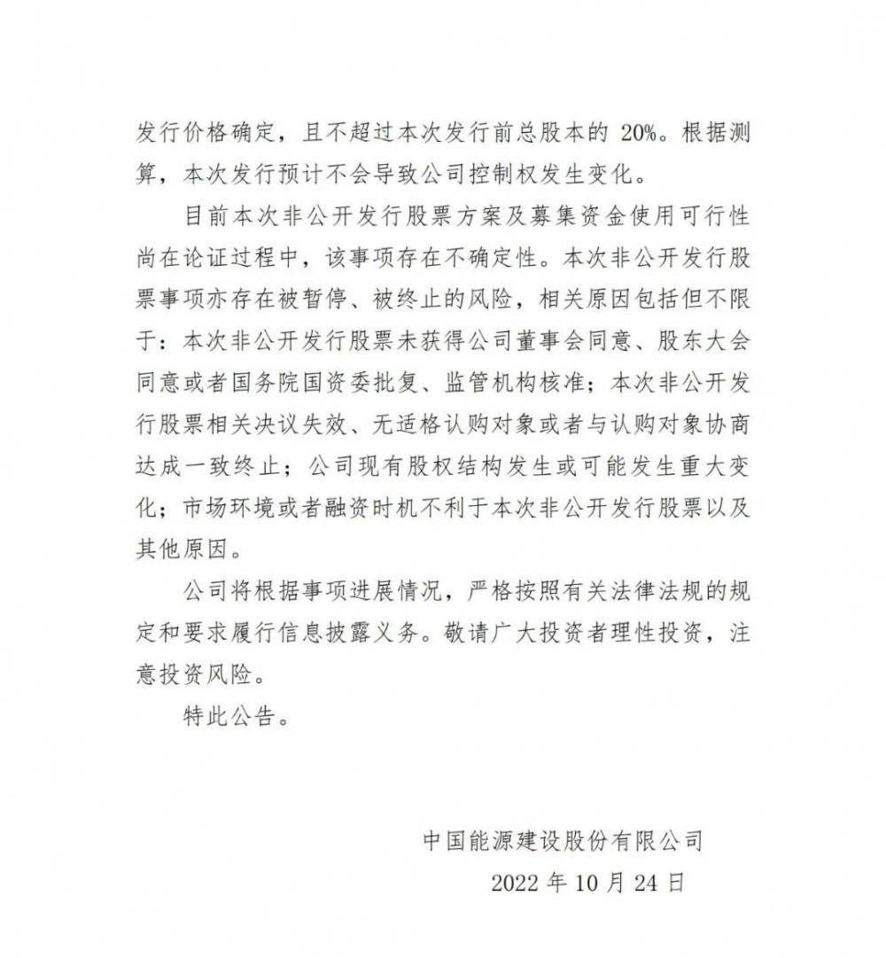 10月23日,中國能建公告稱,為助力公司“30·60”戰(zhàn)略目標(biāo)落地,構(gòu)筑新能源、新基建、新產(chǎn)業(yè)“三新”發(fā)展平臺,公司正在籌劃非公開發(fā)行A股股票事項(xiàng),擬將募集資金用于以新能源為主的新型綜合能源項(xiàng)目,包括光伏、風(fēng)電、氫能、儲能等新能源一體化、專業(yè)化項(xiàng)目,新能源工程施工項(xiàng)目、新能源重大裝備采購,以及生態(tài)環(huán)境治理、新型基礎(chǔ)設(shè)施等項(xiàng)目。據(jù)悉,本次募集資金總額在人民幣150億元以內(nèi)。本次非公開發(fā)行股票方案最終以經(jīng)公司董事會、股東大會批準(zhǔn)及國務(wù)院國資委批復(fù)、本公司證券上市地的證券監(jiān)管機(jī)構(gòu)核準(zhǔn)的方案為準(zhǔn)。