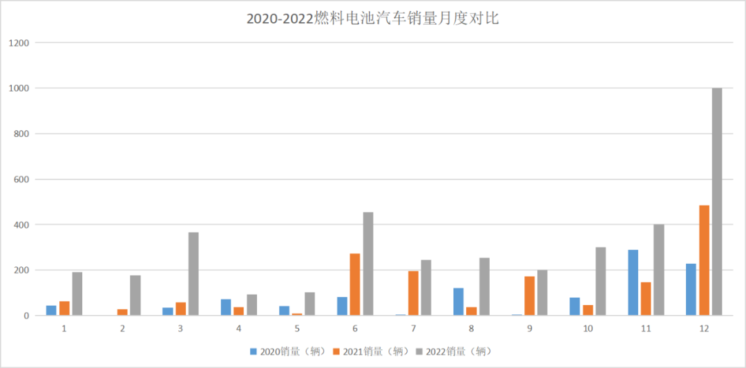 2022年全年,燃料電池汽車產(chǎn)銷分別完成0.4萬輛和0.3萬輛,同比增長105.4%和112.8%。其中,12月份完成產(chǎn)銷數(shù)量最多,均完成0.1萬輛;其次是3月份及6月份,3月,燃料電池汽車產(chǎn)銷分別完成500輛和367輛,同比增長10.1倍和5.2倍;6月,燃料電池汽車產(chǎn)銷分別完成527輛和455輛,同比增長18.7%和67.3%。
