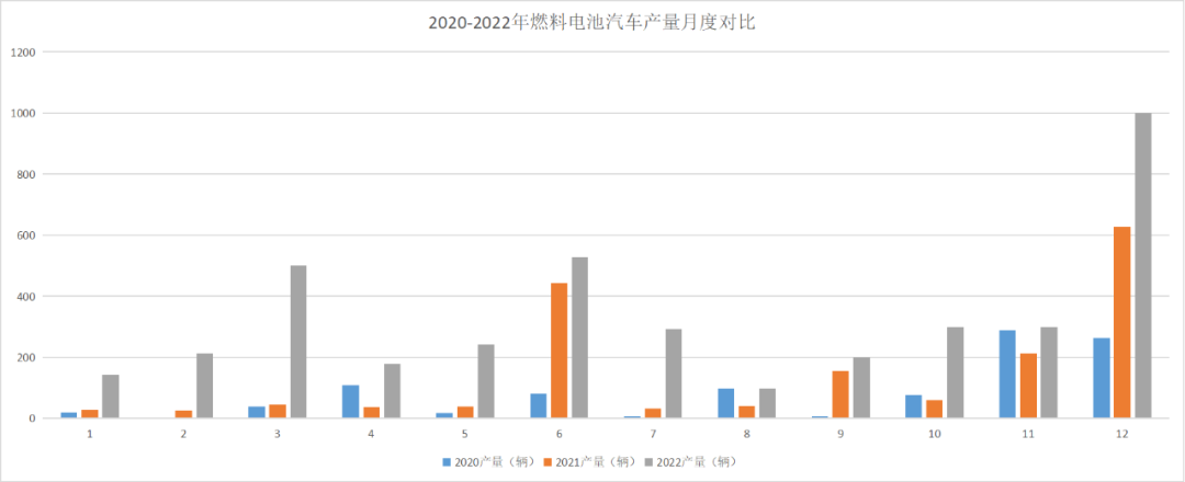 2020-2022年,燃料電池汽車產(chǎn)銷逐年遞增。氫能觀察統(tǒng)計(jì),2020-2022年,燃料電池汽車產(chǎn)量分別完成1000輛、1742輛和4000輛;燃料電池汽車銷量分別完成1000輛、1556輛和3000輛。