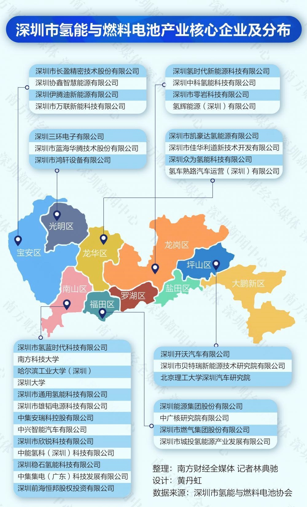 南方財經(jīng)全媒體記者梳理調(diào)研發(fā)現(xiàn),深圳市氫能相關(guān)企業(yè)主要分布在南山區(qū)、寶安區(qū)、龍華區(qū)和龍崗區(qū)。