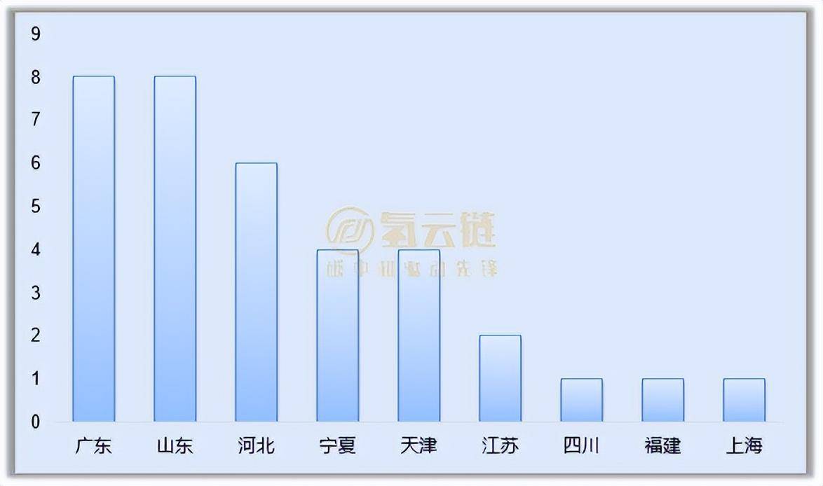 隨著全國氫能產(chǎn)業(yè)的進一步發(fā)展,氫能產(chǎn)業(yè)已成為各省低碳和經(jīng)濟發(fā)展的重要力量。據(jù)氫云鏈統(tǒng)計,已發(fā)布的9個省份中均有氫能產(chǎn)業(yè)項目,共涉及35項,涵蓋整個產(chǎn)業(yè)鏈,其中在項目數(shù)上山東和廣東遙遙領先。氫云鏈分析相關項目的特點如下: