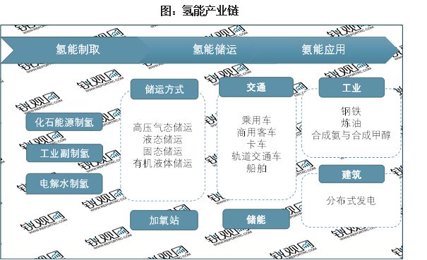 目前氫能產(chǎn)業(yè)已經(jīng)開始形成“制、儲、運(yùn)、用”四大環(huán)節(jié),氫能的利用方式逐漸多元化。上游制取環(huán)節(jié),目前主要有化石能源制氫、工業(yè)副產(chǎn)氫和電解水制氫等方式;中游儲運(yùn)環(huán)節(jié)存在氣態(tài)、液態(tài)、固態(tài)等方式,加氫站等基礎(chǔ)設(shè)施建設(shè)也是重要部分;下游應(yīng)用環(huán)節(jié),當(dāng)前氫能主要應(yīng)用在工業(yè)領(lǐng)域,未來有望擴(kuò)展為交通、工業(yè)、建筑、儲能等多領(lǐng)域。