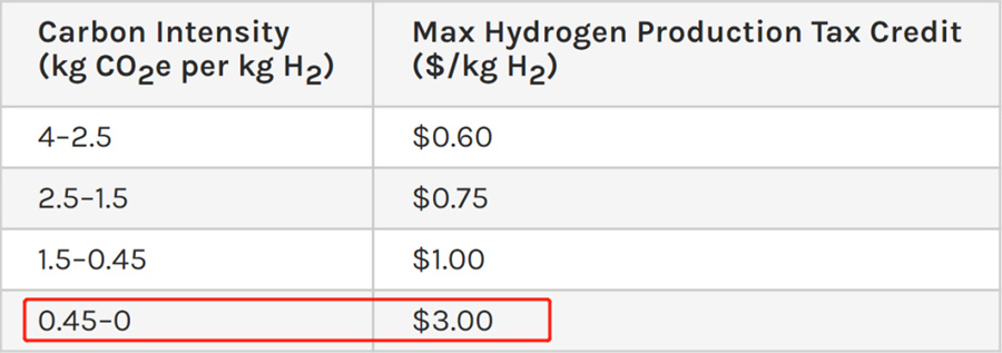 根據(jù)氫氣生產(chǎn)路徑碳強度的不同,稅收抵免激勵程度也不同,比如如果生產(chǎn)1千克的氫氣只排放0-0.45千克的二氧化碳當量,就可以獲得3美元/公斤的最高補貼。并且,綠氫項目還可申請最高30%的投資稅收抵免。