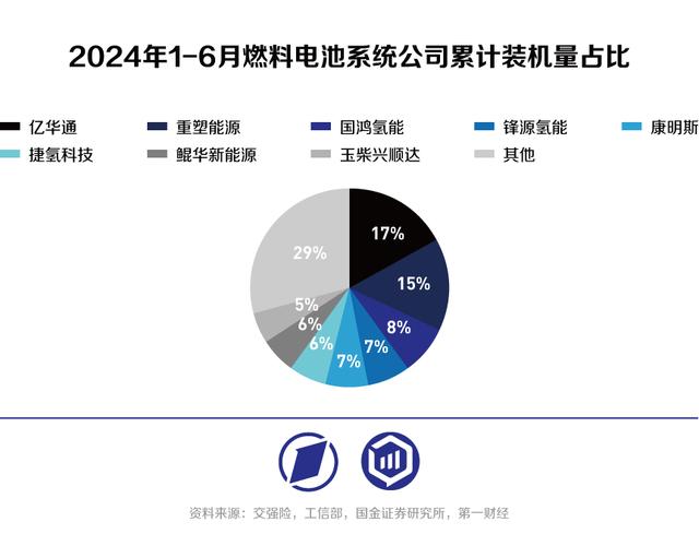 但燃料電池系統(tǒng)供應(yīng)商的競爭格局仍在不斷變化中。2024年1-6月,國內(nèi)燃料電池系統(tǒng)公司累計(jì)裝機(jī)量排名,億華通作為龍頭繼續(xù)保持第一,2-6名分別為重塑能源、國鴻氫能、鋒源氫能、康明斯、捷氫科技,而2023年2-6名分別為捷氫科技、重塑能源、國鴻氫能、濰柴動(dòng)力、未勢(shì)能源。