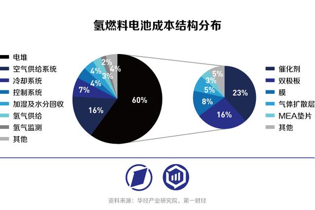 和鋰電、光伏產(chǎn)業(yè)相似,燃料電池走向大規(guī)模市場(chǎng)化的主要路徑是降低成本。根據(jù)華經(jīng)產(chǎn)業(yè)研究院數(shù)據(jù),氫燃料電池成本構(gòu)成中,電堆是最大構(gòu)成部分,占比約60%;在電堆成本構(gòu)成中,催化劑、雙極板和交換膜是主要成本來源,占總?cè)剂想姵爻杀颈壤謩e為23%、16%和8%。