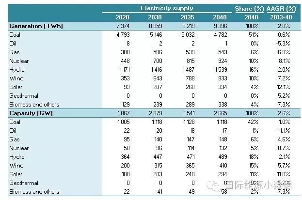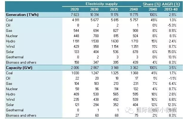2040 年一次能源供應(yīng)達(dá)到46.95億噸標(biāo)油,其中煤炭占51%、石油16%、天然氣13%、核電5%、水電3%、非水可再生能源12%。從發(fā)電量來看,2040年總裝機(jī)達(dá)3145吉瓦,發(fā)電量達(dá)11.78萬億千瓦時(shí),煤電占56%、天然氣發(fā)電9%、核電8%、水電13%、風(fēng)電8%、光伏3%、生物質(zhì) 3%。