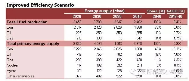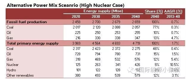 在大大提高能效的情境下,2040年一次能源供應(yīng)只有38.78億噸標(biāo)油,其中煤炭仍占48%、石油16%、天然氣11%、核電6%、水電3%、非水可再生能源14%。從發(fā)電量來看,2040年總裝機(jī)達(dá)2665吉瓦,發(fā)電量達(dá)9.39萬億千瓦時(shí),煤電占51%、天然氣發(fā)電6%、核電10%、水電16%、風(fēng)電 10%、光伏4%、生物質(zhì)4%。