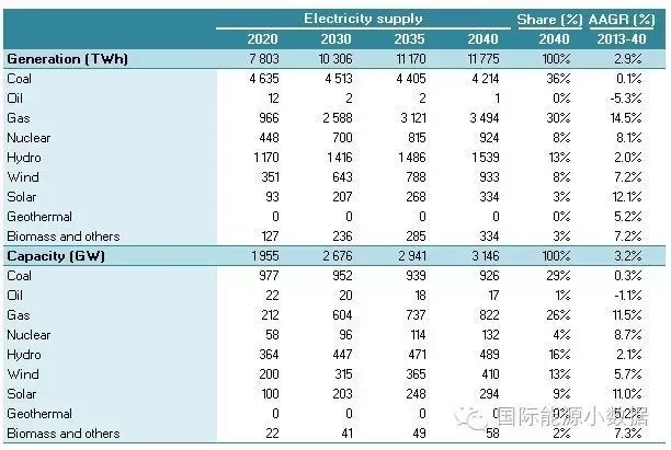 在大力推廣天然氣發(fā)電的情境下,2040年一次能源供應(yīng)為46.13億噸標(biāo)油,其中煤炭跌至40%、石油16%、天然氣高達(dá)23%、核電5%、水電3%、非水可再生能源13%。從發(fā)電量來看,2040年總裝機(jī)達(dá)3146吉瓦,發(fā)電量達(dá)11.78萬億千瓦時(shí),煤電占36%、天然氣發(fā)電30%、核電8%、水電 13%、風(fēng)電8%、光伏3%、生物質(zhì)3%。