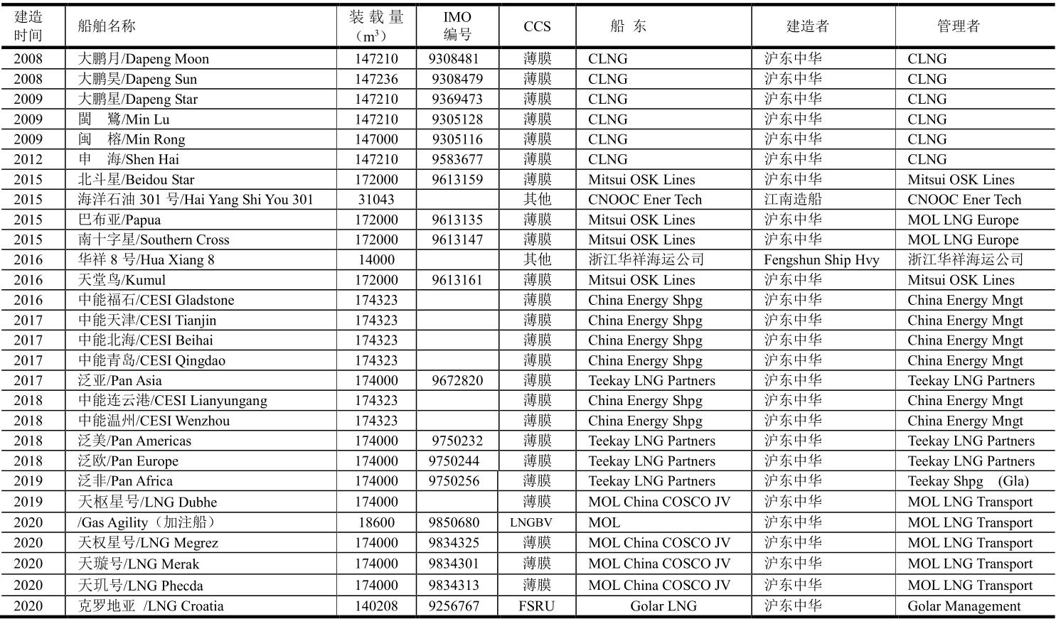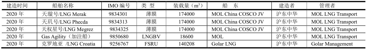2020年全球交付47艘船舶,包括6艘FSRU和11艘小于50000m3的船舶。交付船舶的平均容量(不包括FSRU和小于50000m3的船舶)為174765m3。2020年中國交付了四艘LNG運(yùn)輸船舶。