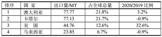 2020年LNG生產(chǎn)國共計(jì)出口356.12MT,2020年LNG出口最多的前4位國家如表。表明最大出口國是澳大利亞和卡塔爾,但增幅美國最大。