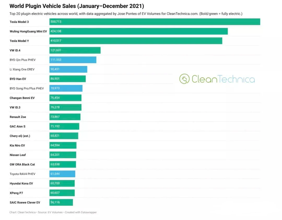 2021年全球新能源品牌銷量榜單火熱出爐。據(jù)CleanTechnica網(wǎng)站公布的2021年全球新能源品牌銷量數(shù)據(jù)顯示,2021年全球新能源車型累計銷量近650萬輛,較去年同期增長108%,其中TOP20品牌銷量476.34萬輛,占全球銷量的73.3%。