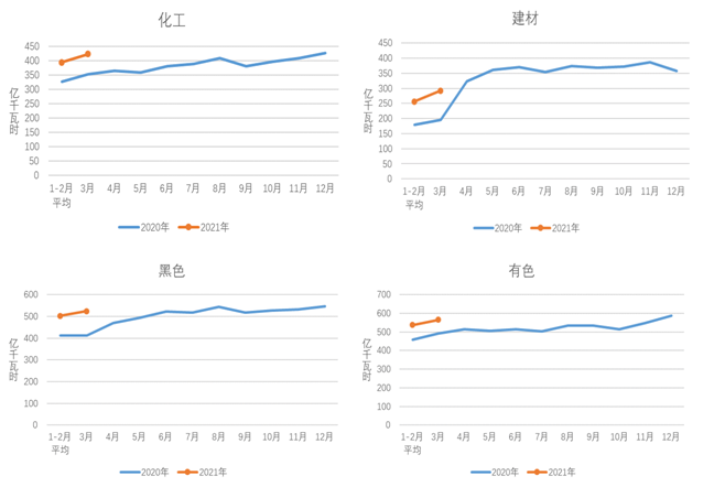 3月份,化工行業(yè)用電量424億千瓦時,同比增長13.6%,增速比上年同期提高15.6個百分點;建材行業(yè)用電量292億千瓦時,同比增長40.9%,增速比上年同期提高58.8個百分點;黑色金屬冶煉行業(yè)用電量524億千瓦時,同比增長26.2%,增速比上年同期提高32.1個百分點;有色金屬冶煉行業(yè)用電量565億千瓦時,同比增長11.4%,增速比上年同期提高6.8個百分點。