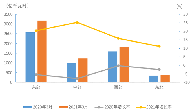 3月份,東、中、西部和東北地區(qū)全社會用電量增速分別為20.4%、25.3%、15.8%和11.2%。