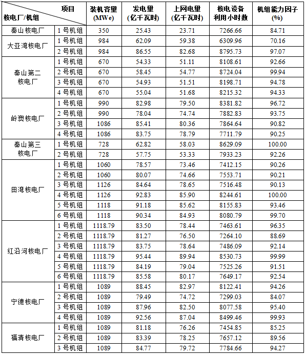 3)本表“合計值/整體值/平均值”中,裝機(jī)容量、發(fā)電量、上網(wǎng)電量為各機(jī)組合計值,核電設(shè)備利用小時數(shù)為全部機(jī)組整體值,機(jī)組能力因子為全部參與統(tǒng)計機(jī)組的算數(shù)平均值。