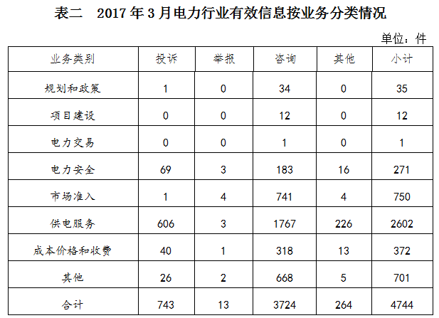 2017年3月收到的有效信息中,電力行業(yè)類4744件,占77.62%;新能源和可再生能源行業(yè)類592件,占9.69%;石油天然氣行業(yè)類80件,占1.31%;煤炭行業(yè)類6件,占0.10%;其他事項690件,占11.28%。