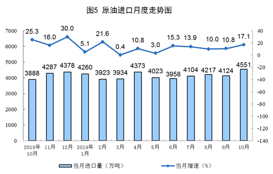 10月份,原油進口4551萬噸,同比增長17.1%,增速比上月加快6.3個百分點。1—10月份,原油進口41454.5萬噸,同比增長10.5%。