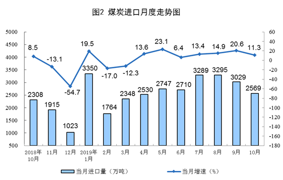 10月份,煤炭進口2568.5萬噸,同比增長11.3%,增速比上月回落9.3個百分點;1—10月份,煤炭進口2.8億噸,同比增長9.6%。