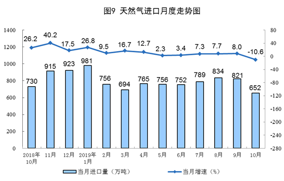 10月份,天然氣進口652萬噸,同比下降10.6%,增速由正轉(zhuǎn)負,上月為增長8.0%。1—10月份,天然氣進口7771萬噸,同比增長7.9%。