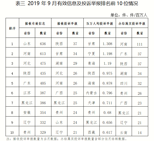 各?。ㄗ灾螀^(qū)、直轄市)按照收到的有效信息數(shù)量排序,山東、河南、河北、陜西、廣東等排在全國前10位;按照投訴舉報(bào)數(shù)量排序,陜西、甘肅、湖南、河北、河南等排在全國前10位。按照百萬人均投訴舉報(bào)數(shù)量排序,甘肅,寧夏,青海,陜西,海南等排在全國前10位。按照辦結(jié)屬實(shí)投訴舉報(bào)數(shù)量排序,河南、廣東、陜西、湖南、四川等排在全國前10位。(2019年9月有效信息及投訴舉報(bào)排名前10位情況見表三)