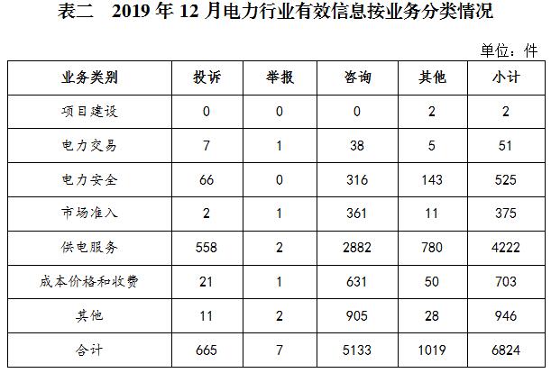 電力行業(yè)排在首位,有效信息數(shù)量為6824件,占全部有效信息的81.05%;其中受理的投訴舉報(bào)數(shù)量為672件,占全部投訴舉報(bào)數(shù)量的97.39%。群眾反映的問(wèn)題主要集中在供電服務(wù)、電力安全、成本價(jià)格和收費(fèi)等方面。(2019年11月電力行業(yè)有效信息按業(yè)務(wù)分類(lèi)情況見(jiàn)表二)